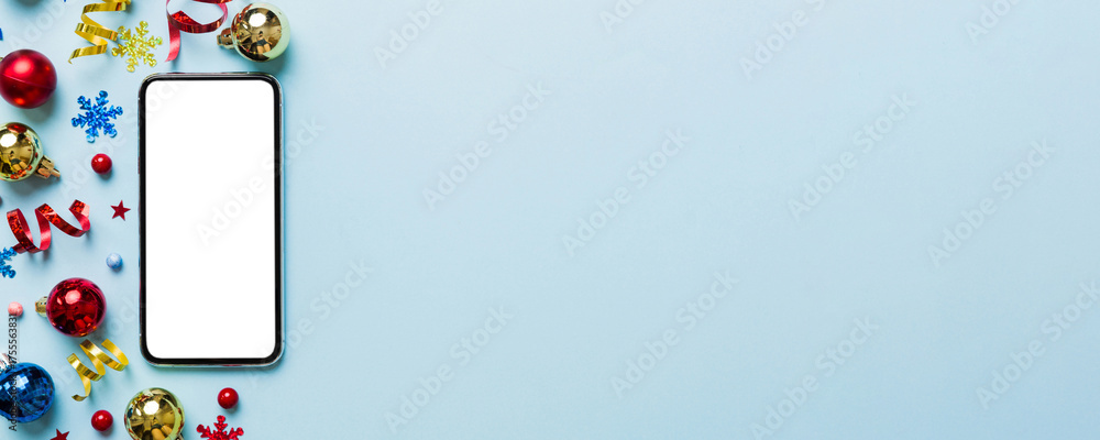 Christmas online shopping from home phone with blank white display top view. smart mobile with copy space on colored background with Christmas decorations balls,. Winter holidays sales background