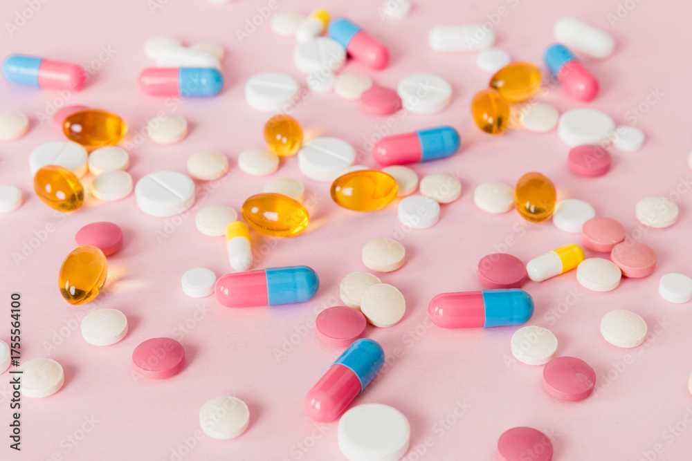 Many different colorful medication and pills perspective view. Set of many pills on colored background