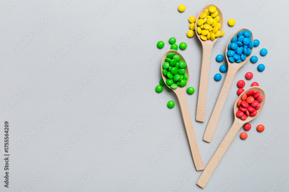 delicious colorful sweet candies on spoon on colored background . Confectionery decor top view with copy space