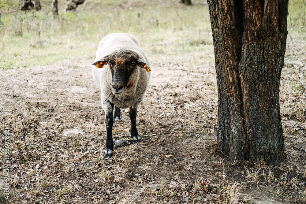 Dark-faced sheep standing alone near a tree in dry rural terrain. Lost sheep, unsupervised livestock, animal welfare, rural isolation