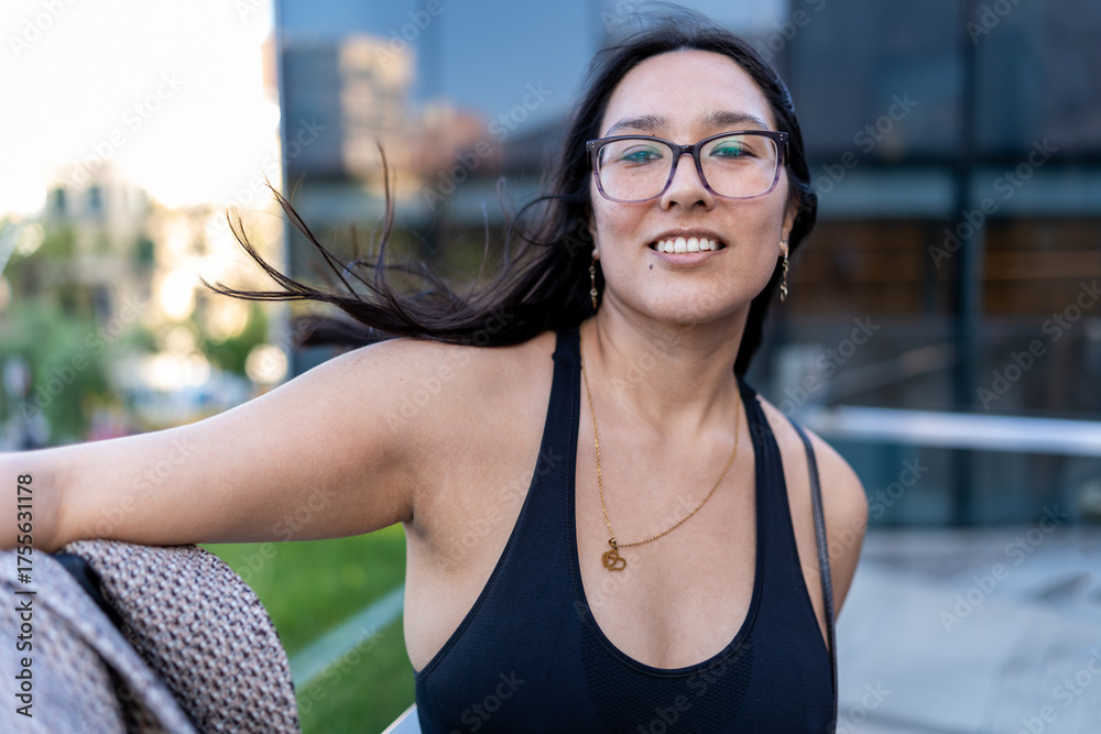 Latina woman smiling, wearing glasses, traveling urban city outdoors