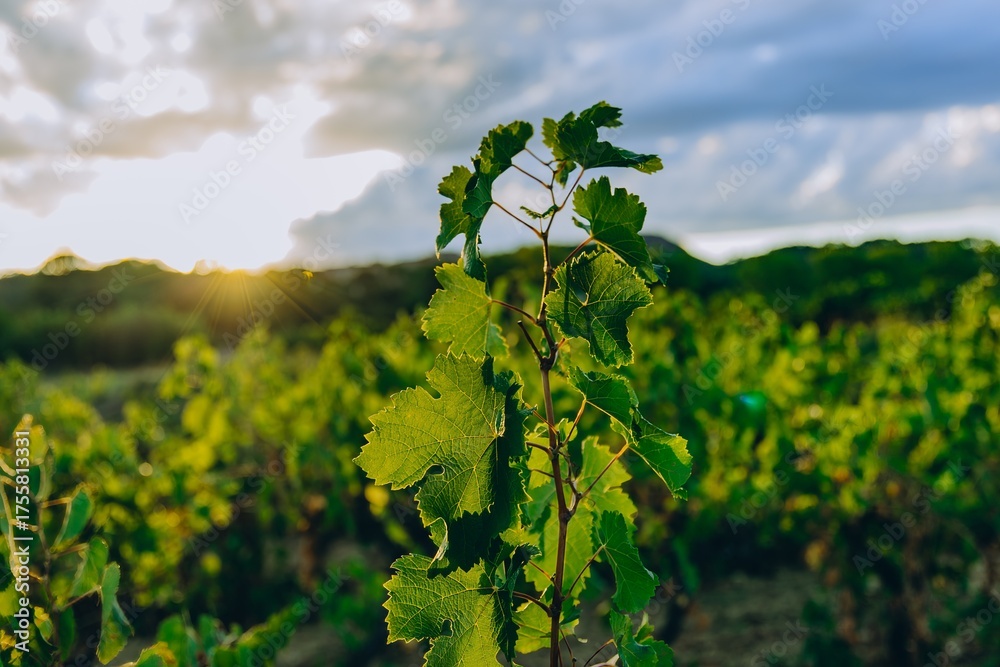 Young grapevine plant in vineyard at golden sunset. Vibrant green leaves glowing in warm light. Organic agriculture and winemaking concept