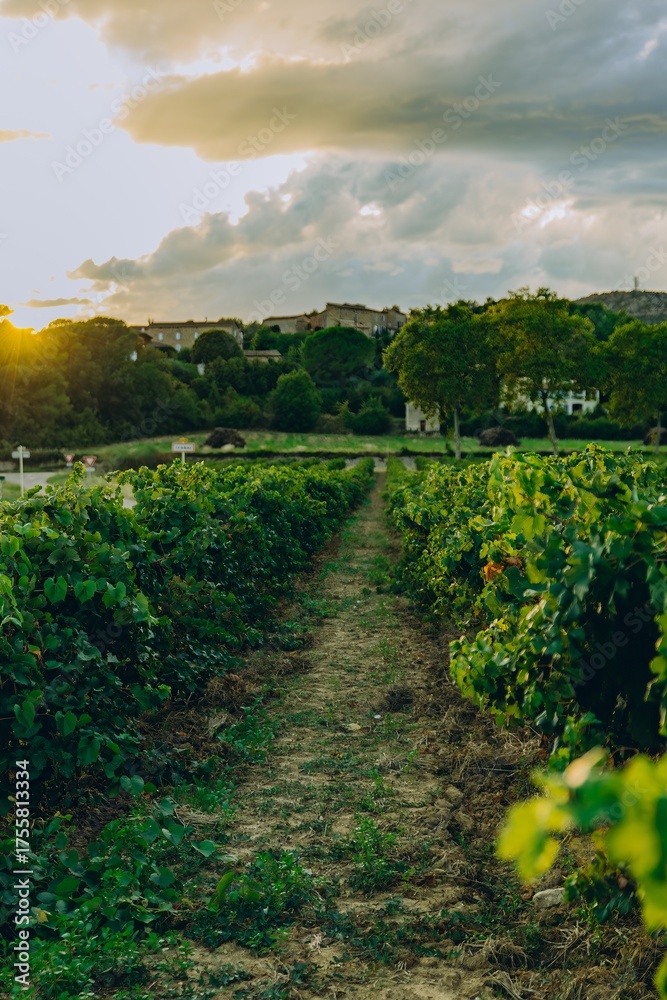 Young grapevine plant in vineyard at golden sunset. Vibrant green leaves glowing in warm light. Organic agriculture and winemaking concept