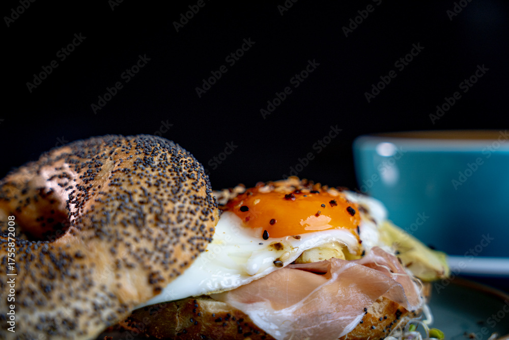Side view of a breakfast with bagel sandwich, fried egg, prosciutto and avocado, topped with sesame, poppy seeds, on ceramic plate, and cup of cappuccino with latte art, on black background.