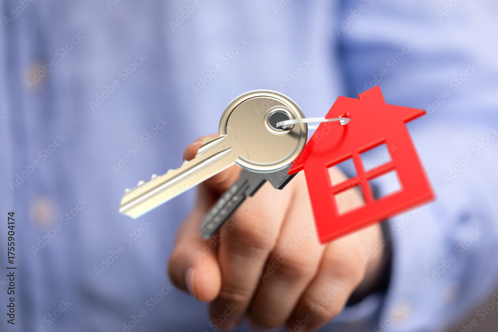 Person offering house key with home-shaped charm representing ownership, new home, real estate investment, mortgage and property, concept.