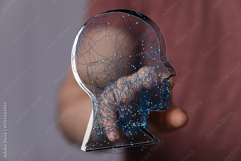 Abstract image of a human head with neural connections, representing AI, technology, and the future.