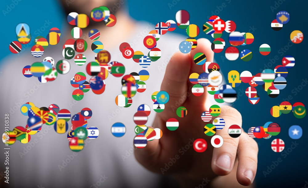 A hand pointing at a collection of country flags, symbolizing global connections, international relations, and the concept of a unified world. D