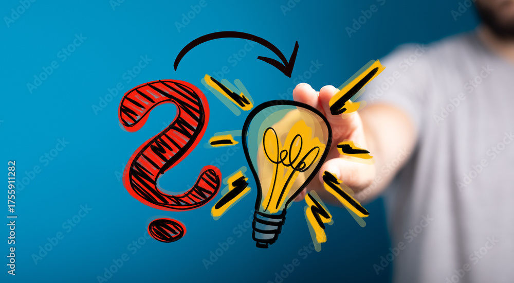 A hand interacts with digital question mark and glowing light bulb, symbolizing problem solving, brainstorming, and generating new creative idea