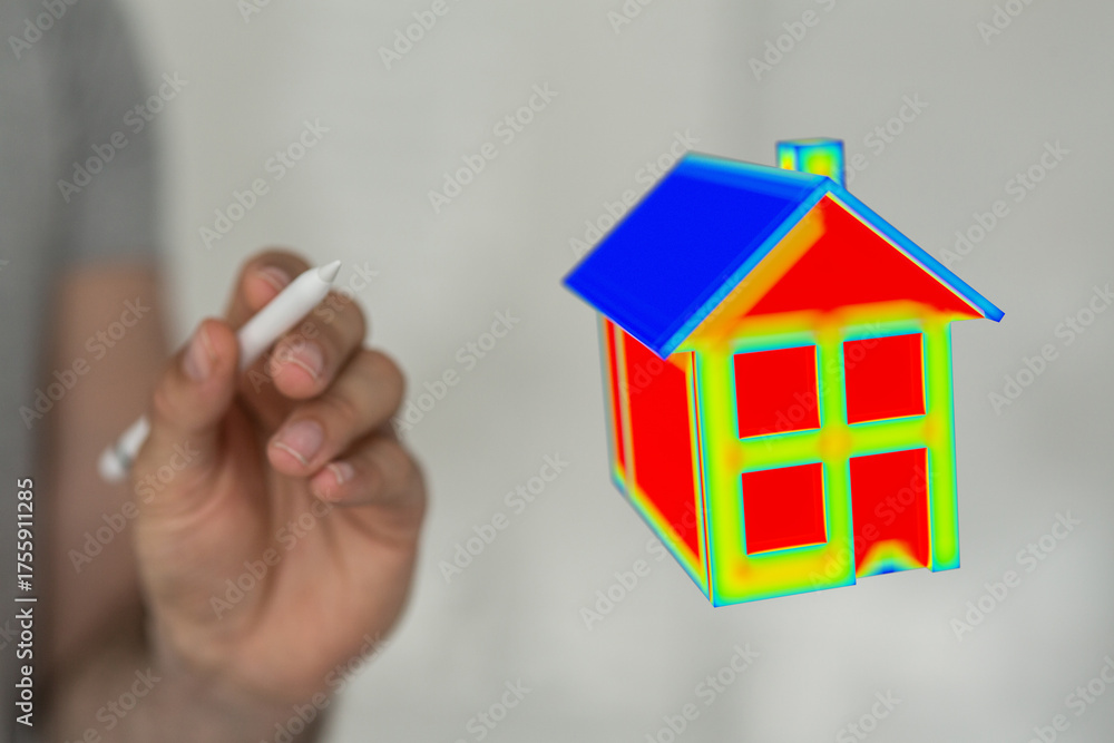 Concept of house model and hand with a pen, property, energy, heat, innovation, home, future, real estate, digital, technology