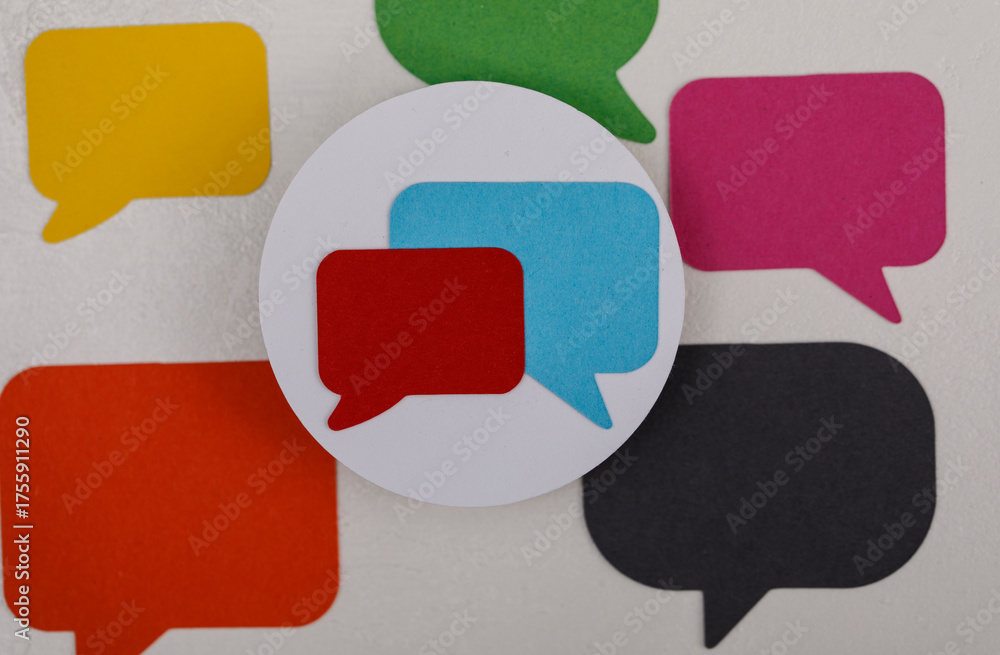 A collection of colorful speech bubbles on a white background, symbolizing communication, discussion, and dialogue in a creative and vibrant des
