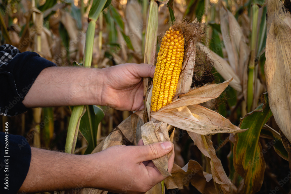 A person carefully checks a ripe ear of corn in a cornfield as the sun begins to set. The surrounding plants show signs of maturity, highlighting harvest time