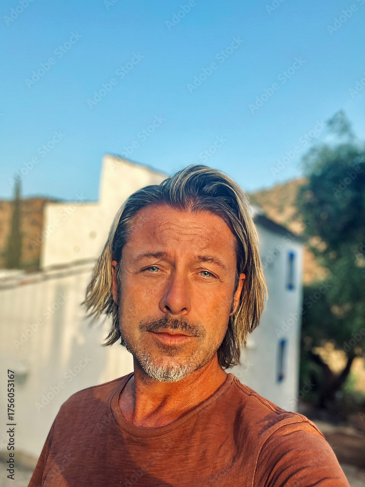 Man with half long blond hair and grey beard wearing brown t-shirt outside by spanish white house in countryside during golden hour.