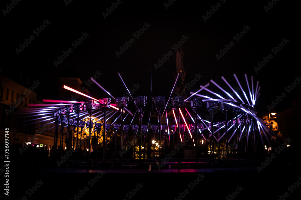 The fascinating night scene captures a modern light installation that dominates the space with a futuristic aesthetic and consists of a number of diagonally arranged led tubes in a circular formation.