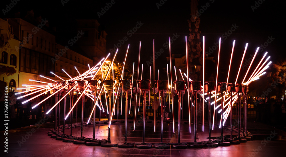 The fascinating night scene captures a modern light installation that dominates the space with a futuristic aesthetic and consists of a number of diagonally arranged led tubes in a circular formation.