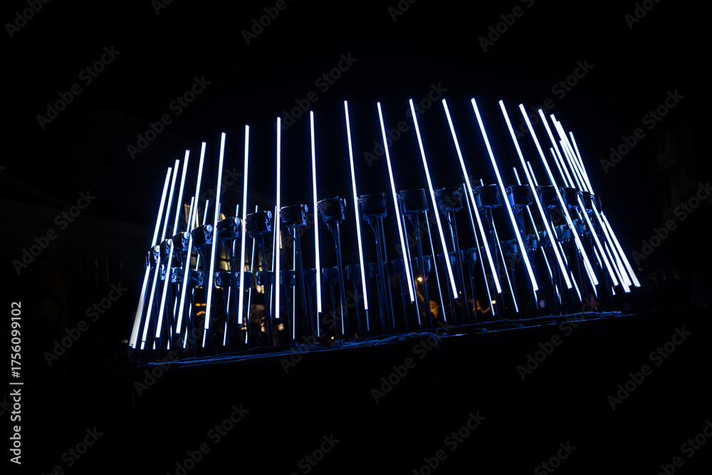 The fascinating night scene captures a modern light installation that dominates the space with a futuristic aesthetic and consists of a number of diagonally arranged led tubes in a circular formation.