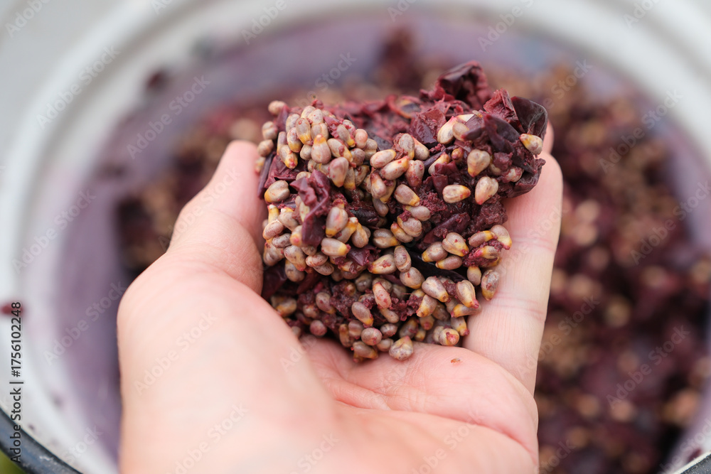 Grapes Pomace or Marc with Skins, Pulp, and Seeds in the Winemaker's Hand. Wine Making. Shallow Depth of Field.