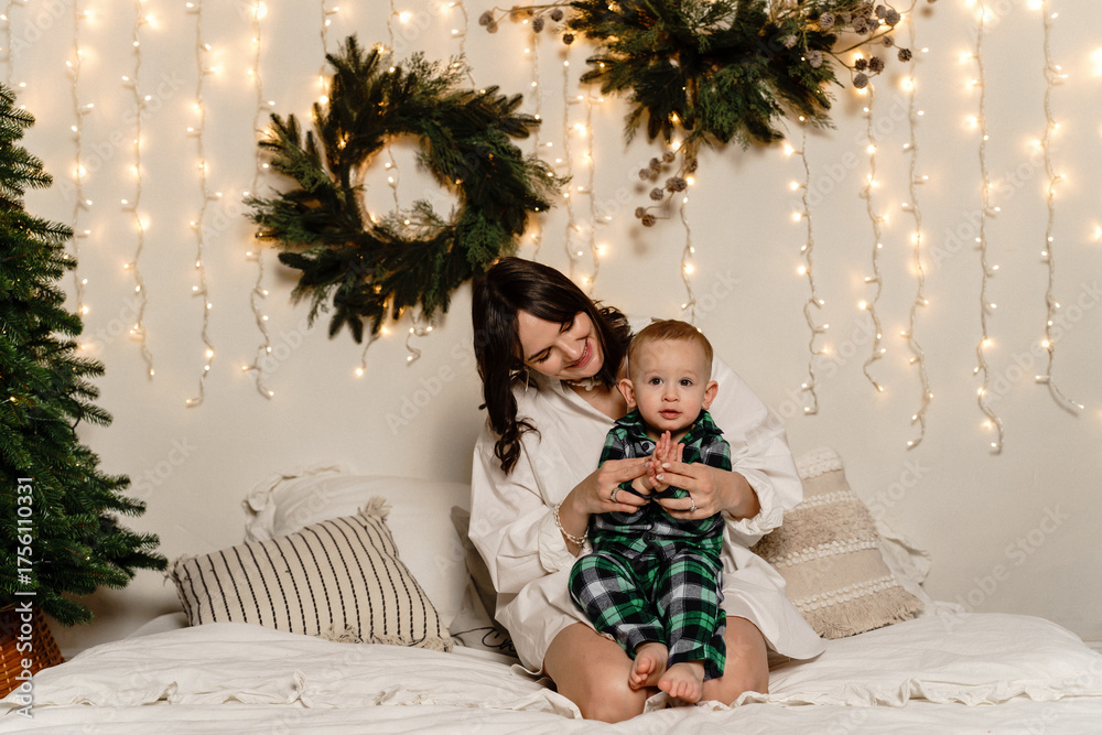 Mom in the bedroom on the bed with her son at Christmas lesson, having fun, playing with sticks