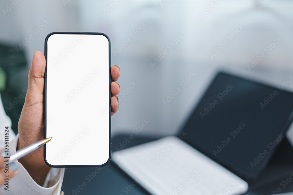 Hand holding smartphone with blank white screen, mobile app mockup and digital technology concept