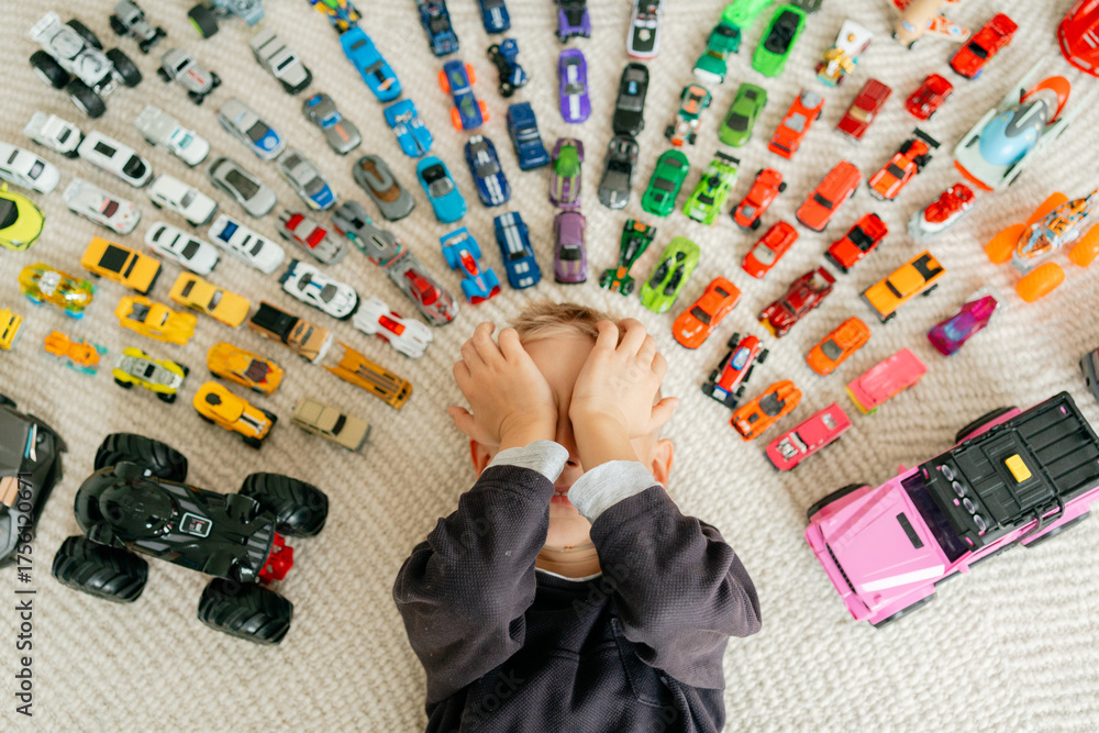 Candid scene of a child hiding his face amid an array of miniature vehicles, playful, intimate home playtime