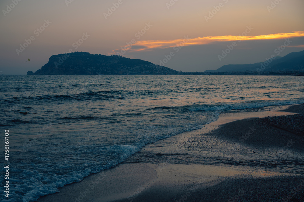 Calm waves gently washing sandy beach at dusk with golden sunset light reflecting on water and distant hills along the coastline on Alanya beach in Turkey