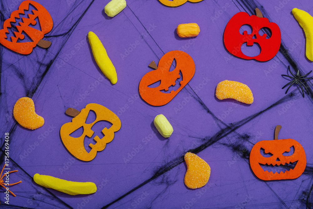 Funny Halloween background. Scary spider web, traditional fall pumpkins, bats and spiders