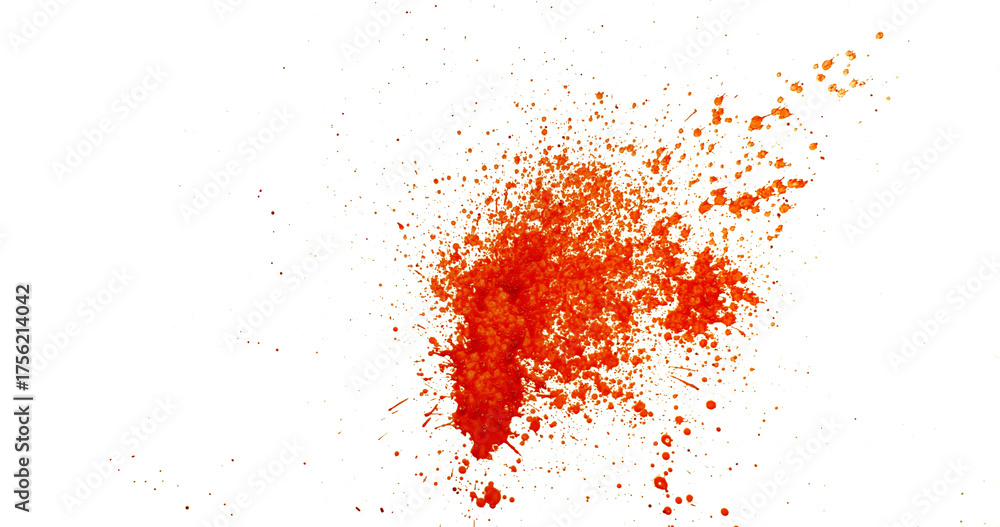 Photograph capturing a dramatic blood splash on a clean white background. The red liquid forms organic droplets and abstract shapes. Adeal for horror, medical, or artistic use.