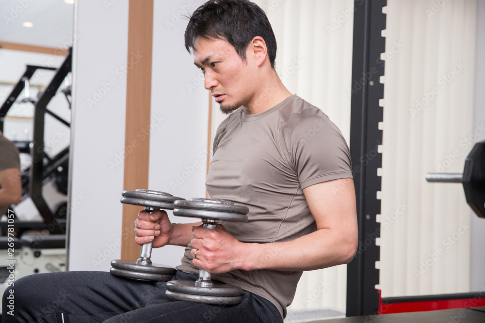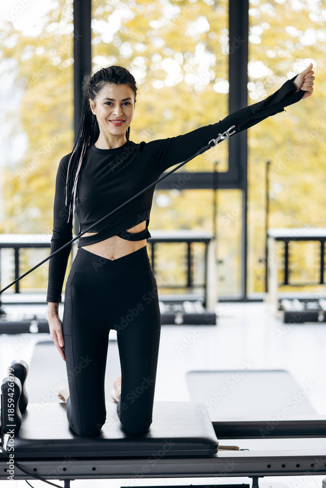 Cadillac and reformer, caucasian man doing Pilates exercises to strengthen body and stretch. practicing physical fitness exercises on Pilates machine. Reformer pilates studio machine for workouts