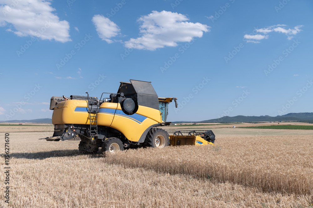Una cosechadora en pleno trabajo segando cereal en una finca durante el verano