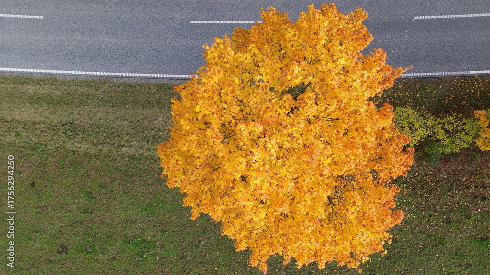 Aerial Drone Top View of Bright Yellow Autumn Tree Beside Country Road in Rural Germany