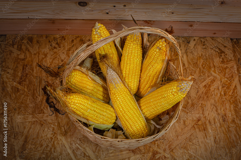 A close up of freshly picked yellow corn on the cob, partially covered in its green husk. The vibrant colors and textures highlight the freshness and natural beauty of farm grown produce.