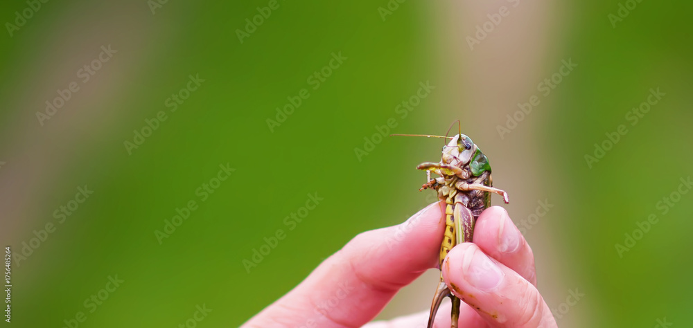 Insect perched on human hand in sunlight. Balance and gentle interaction.