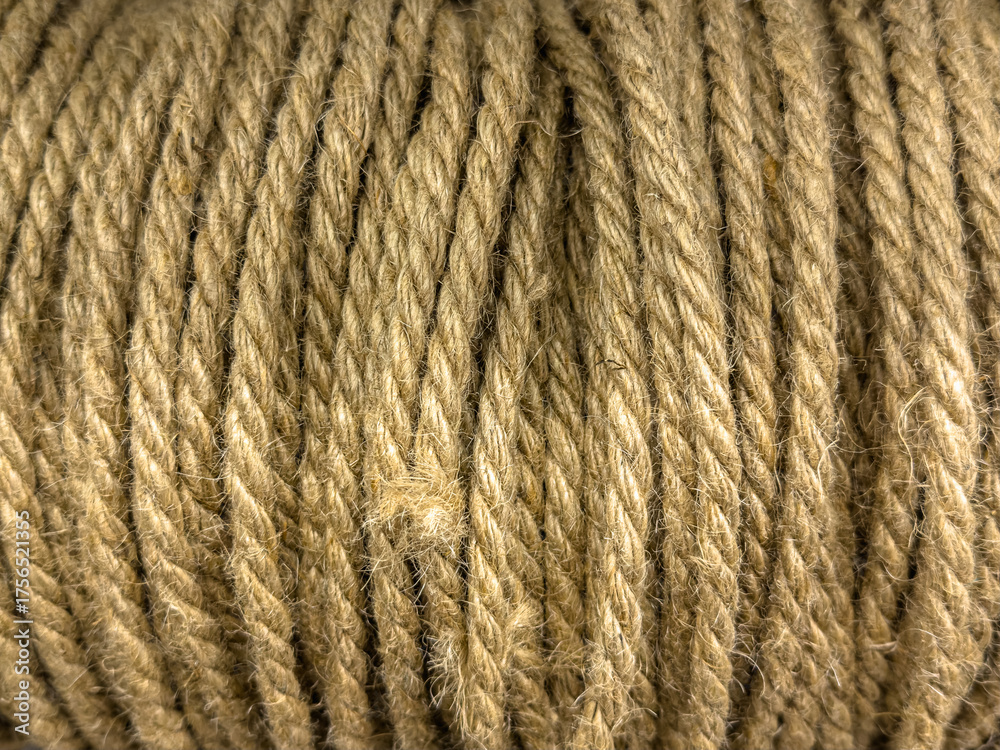 Close-up of coiled natural jute rope, perfect for packaging, construction rigging, industrial binding, and securing loads in shipping and agriculture.