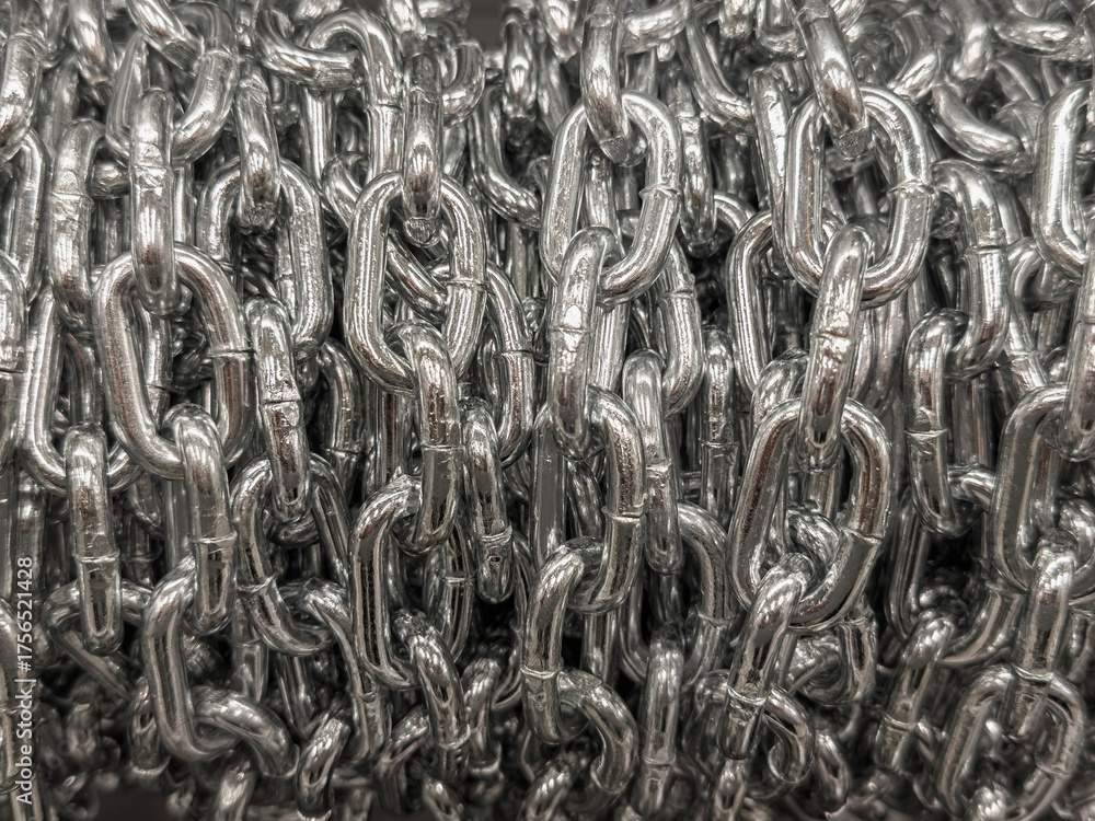 Close-up of coiled heavy-duty steel chain links, vital for construction rigging, industrial lifting, cargo securing, and binding in shipping and manufacturing.