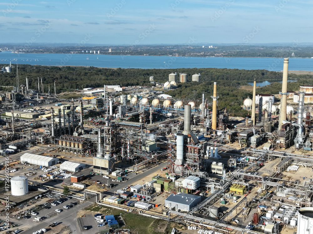 Oil refinery aerial view, shot from a drone. Production of oil and chemicals.