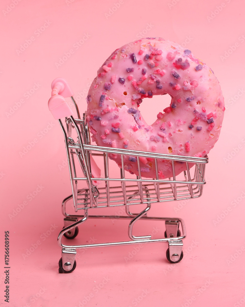 Pink donut in a supermarket cart on a pink background