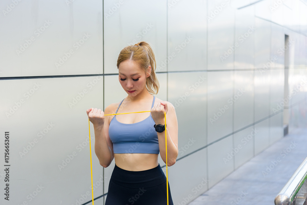 Workout for fit sport woman, outdoor exercise with resistance band builds strength, full body stretch improves flexibility, dedicated workout for people