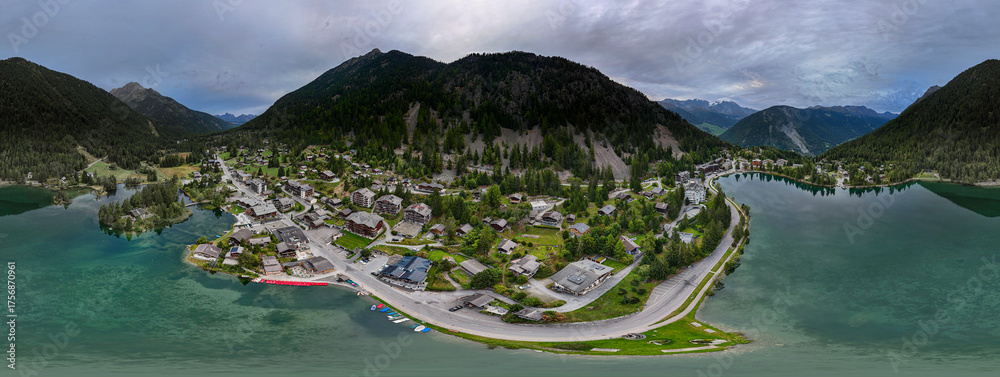 High resolution extreme color aerial panorama take with drone of the famous Swiss town of Champex Lac with its peaceful lake and alp mountains surrounding it part of the famous TMB- Tour du Mont Blan