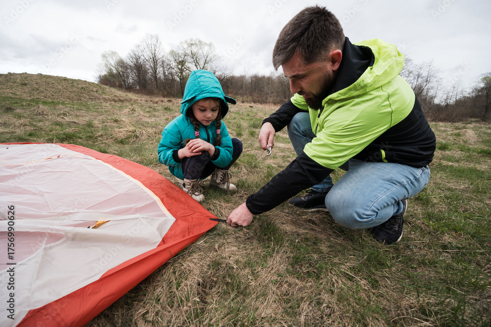 Father and daughter share a memorable moment while setting up a tent in a serene outdoor setting under a cloudy sky during early spring
