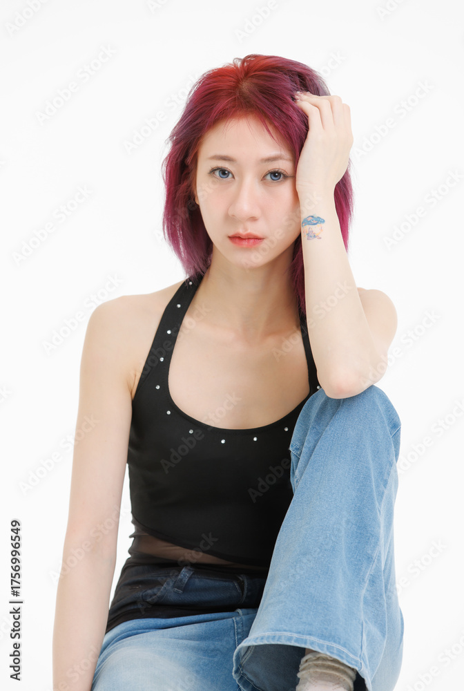 Asian confident young woman purple short hair posing sitting on cube box smile wearing black sleeveless top blue jeans on white background in studio street outfit fashion portrait casual trendy style