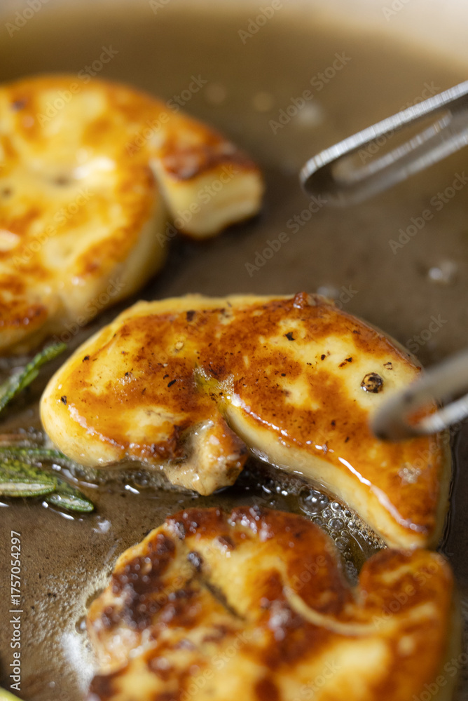 Chef's Tongs Lifting a Perfectly Seared, Golden-Crusted Foie Gras Slice from the Hot Pan, Highlighting Rich, Decadent Juiciness