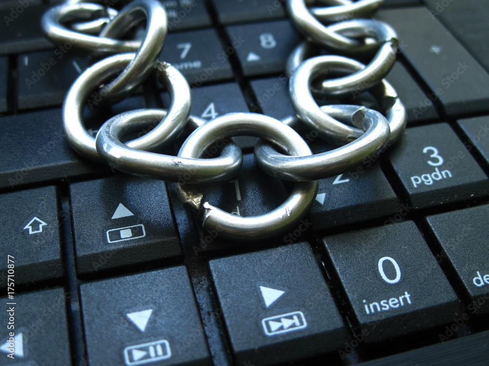 Chain with lock on computer keyboard. It means laptop banned or internet banned. Symbol of computer addiction, games, social networks and so on