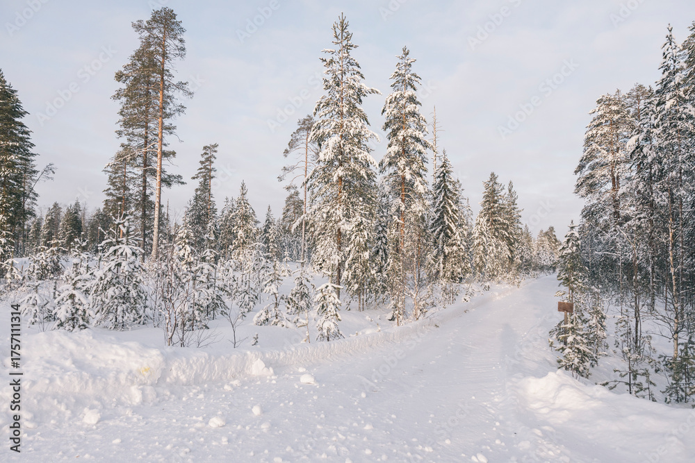 Snow covered path leads through a tranquil winter forest, inviting exploration and adventure