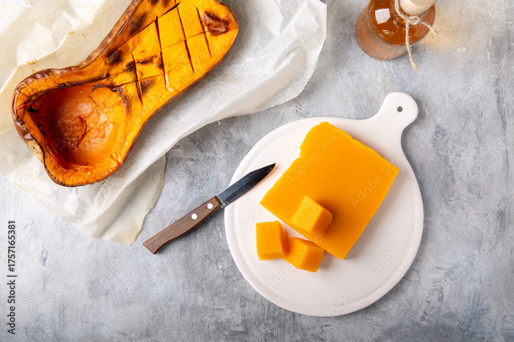 Pumpkin marmalade. Homemade pumpkin jelly candies on white plate on gray background. Top view.