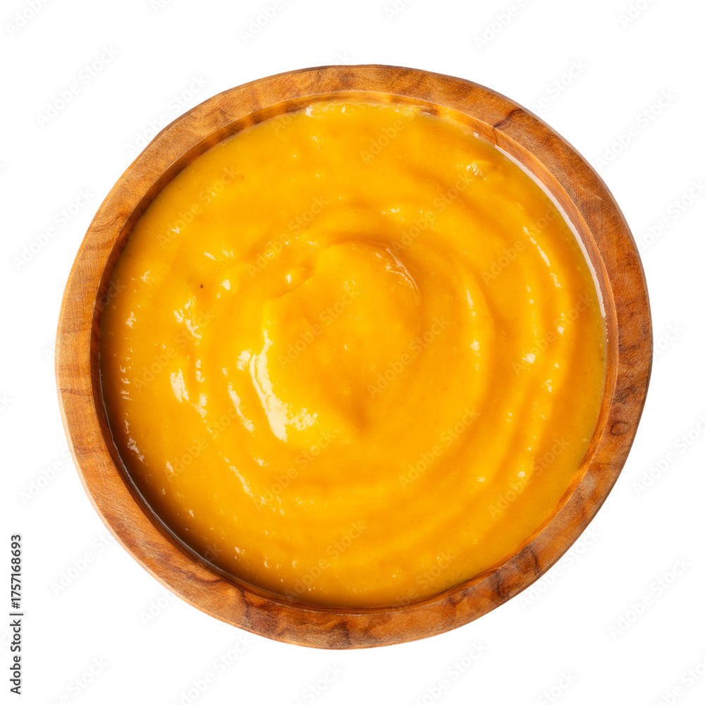 Pumpkin soup puree, cream soup in wooden bowl isolated on white background. Top view.
