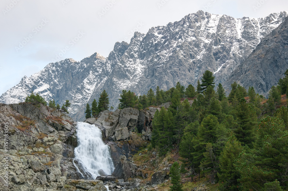 View on Kuyguk waterfall and snow-covered peaks of Altai mountains in late august, Russian Federation