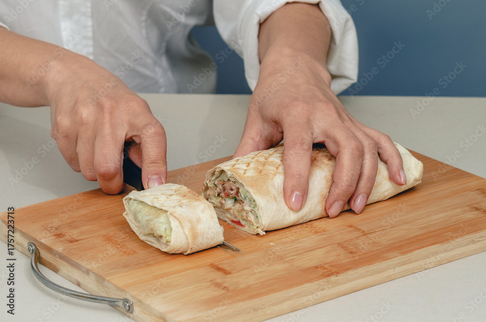 Cutting appetizing shawarma to pieces with knife on wooden surface. Concept of delicious fast food.