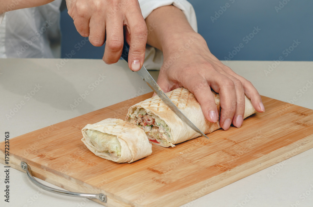 Cutting appetizing shawarma to pieces with knife on wooden surface. Concept of delicious fast food.