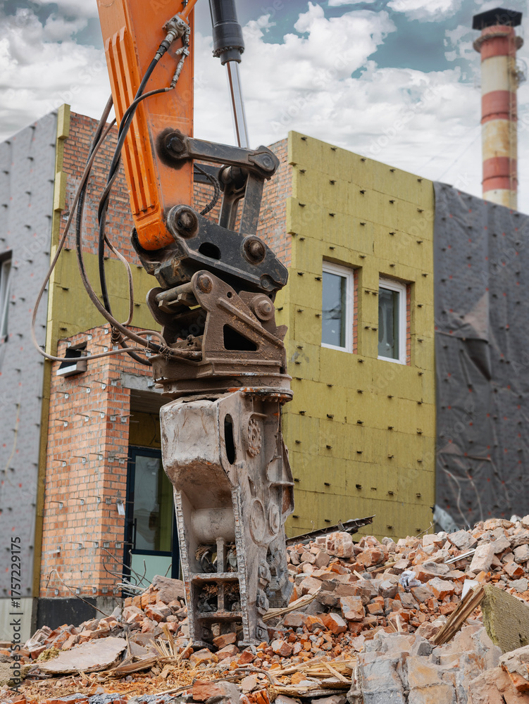 Powerful excavator dismantles building in urban demolition project at dawn