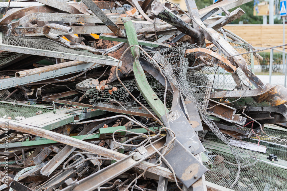 Demolition site with dismantled building materials piled high during construction project in urban area