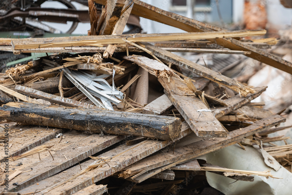 Demolition activity at a construction site reveals dismantled building materials in a cluttered pile